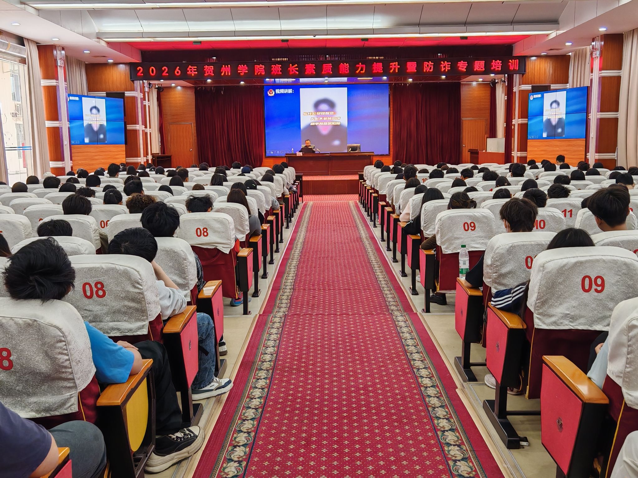 为夯实校园反诈工作基础,提升学生骨干综合能力,3月17日下午,我校2026年班长素质能力提升暨防诈专题培训”在西校区行政楼二楼多功能报告厅顺利举办,在校班长参加培训。贺州市公安局刑侦支队反诈中心四大队教导员魏光灵应邀担任主讲嘉宾。