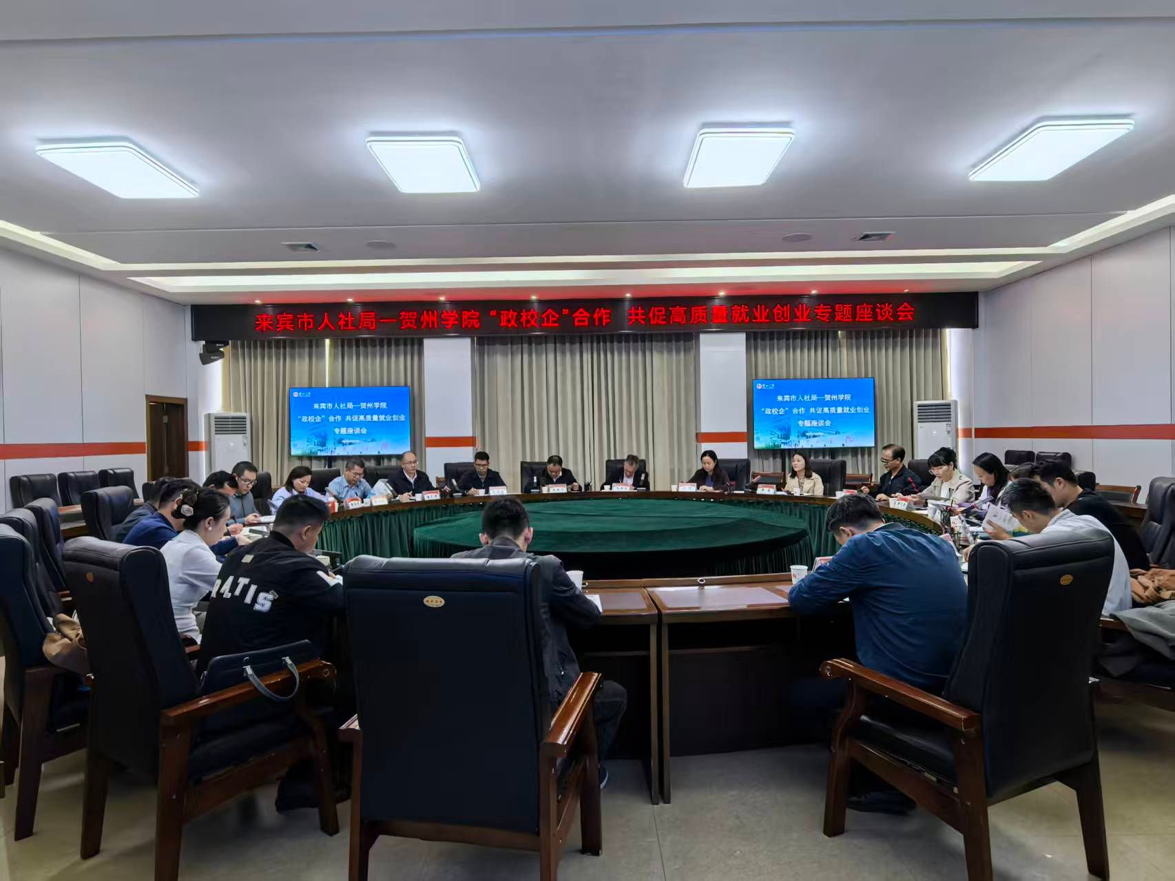 10月29日下午,来宾市人社局调研组来访我校,与我校在行政楼102会议室举行了“政校企”合作 共促高质量就业创业专题座谈会,来宾市人力资源和社会保障局党组书记、局长莫德业、我校党委副书记毛芳才出席会议并讲话,学生工作部(处)部(处)长蒋莹主持会议。
