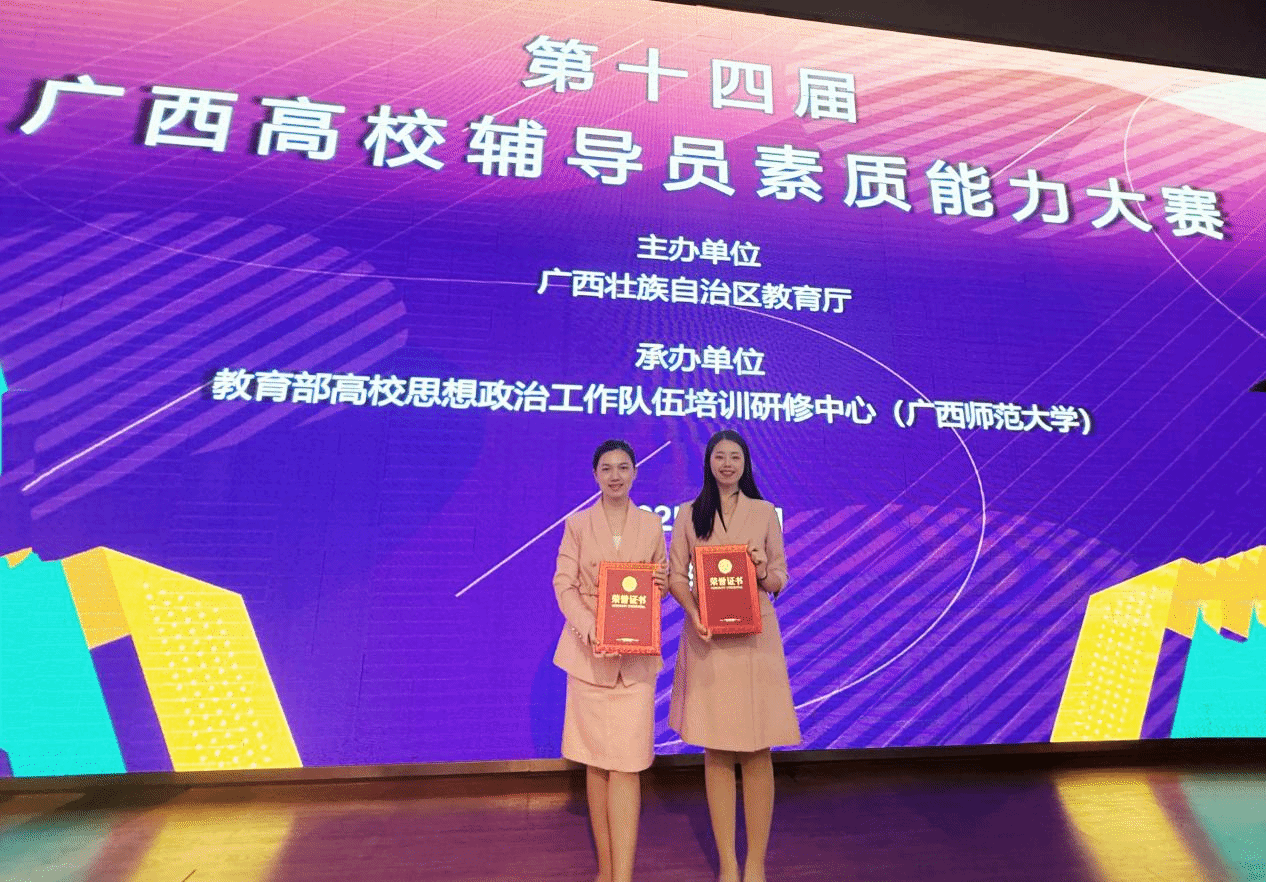 近日,由自治区教育厅主办、教育部高校思想政治工作队伍培训研修中心(广西师范大学)承办的第十四届广西高校辅导员素质能力大赛在广西桂林圆满结束,共有来自全区113名优秀辅导员参赛。经过激烈角逐,我校辅导员李婷、蒋欣利荣获大赛二等奖