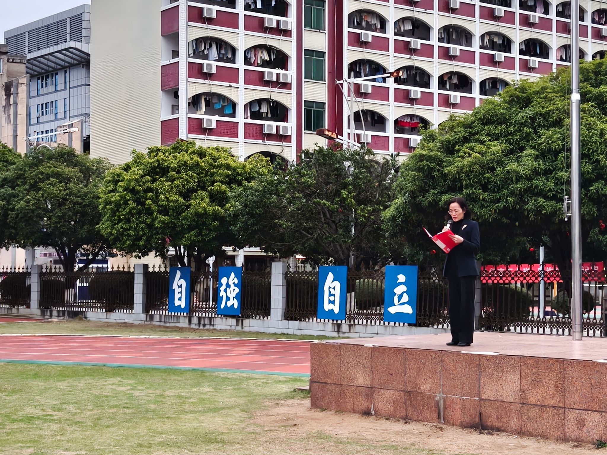 升旗仪式后,学校领导对同学们提出三点期望:一是立报国之志,胸怀家国,将个人理想融入国家发展大局;二是求学问之真,潜心向学,以优秀学子为榜样练就过硬本领;三是强健康之身,走出宿舍、走进操场,在运动场上挥洒汗水、保持眼中光彩,锻造强健身心。