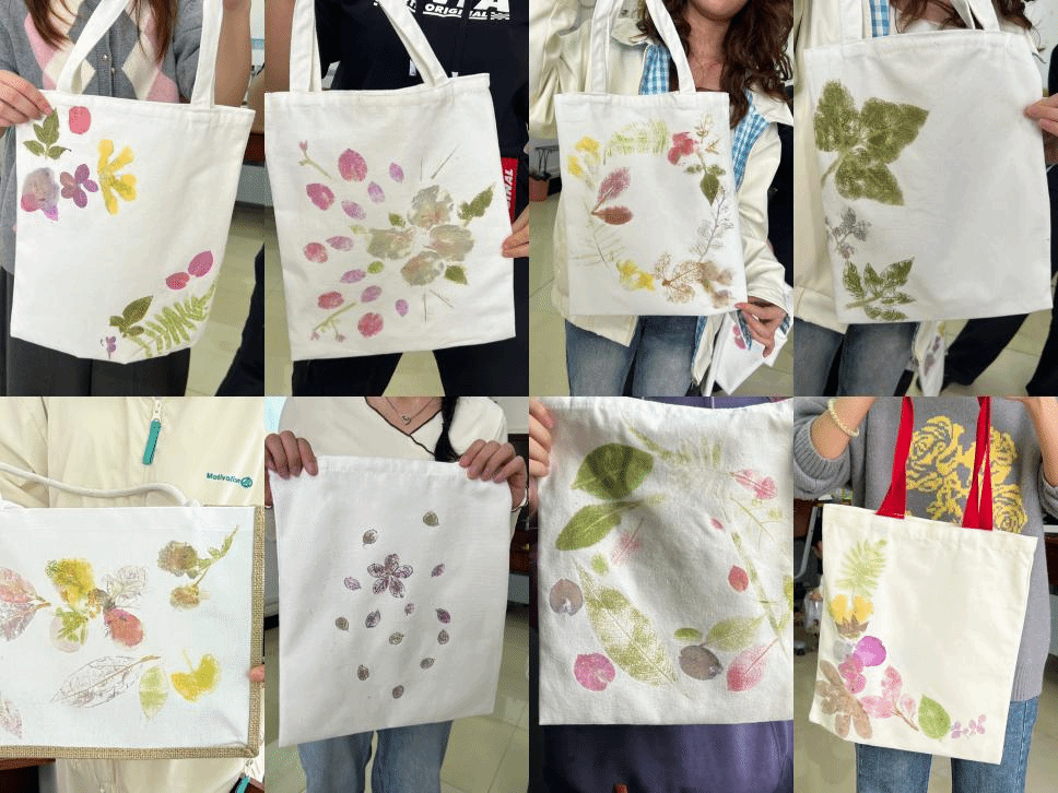 本次活动创新融合美育浸润、艺术疗愈与心理疏导,通过系统讲解艺术心理与手工疗愈知识,深入解读植物拓染的文化内涵与技艺方法,帮助学生理解“自然联结+艺术表达”的疗愈机制。实践环节中,同学们亲自采集校园植物,运用工具将植物素材拓印于帆布袋上,创作出各具特色的植物拓染作品。现场氛围专注而愉悦,学生在感受传统文化,提升了艺术素养的同时,有效缓解了心理压力,增强了自信与成就感。